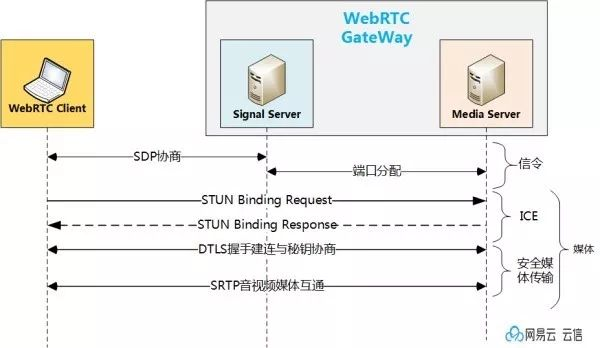 首先,我们网关的Media Server拥有公网IP,因此Server就不需要通过Stun Server收集自身的公网IP。WebRTC客户端先与网关SignalServer协商SDP,包括ICE Candidate,Media Server分配IP和端口作为网关的ice candidate发送给客户端。因为网关是公网IP,所以客户端向这个IP发送STUN Binding Request会被服务器收到, 并回复Response。接着客户端与网关媒体服务器进行DTLS握手与秘钥协商,在此基础上进一步进行SRTP的音视频通信。至此,WebRTC客户端与网关服务器建连成功。