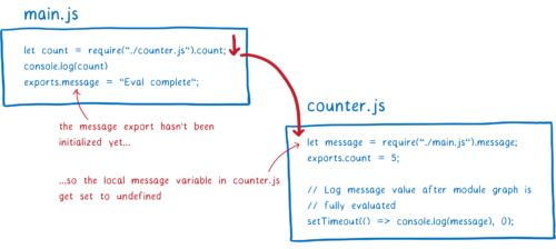 如果使用动态绑定处理导出,则 counter 模块最终会看到正确的值。在 timeout 运行时,main.js 的求值已经结束并填充了该值。