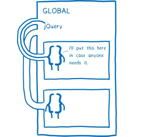 这使得维护代码非常棘手。这让移除老代码或老 script 标签变成了一场轮盘赌游戏。你不知道会弄坏什么。代码的不同部分之间的依赖关系是隐式的。任何函数都可以获取全局作用域中的任何东西,所以你不知道哪些函数依赖于哪些 script 标签。