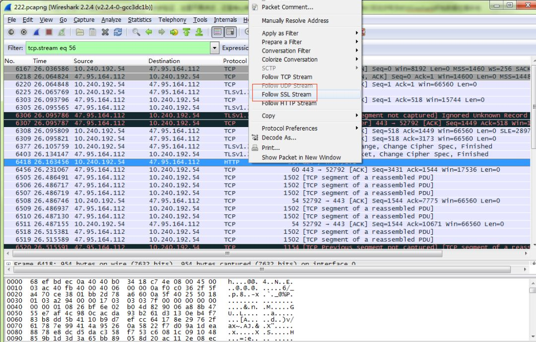 觉得这样太难看了?OK,也可以像HTTP一样,通过鼠标右键在菜单栏中选择“Follow SSL Stream”,查看完整的HTTPS解密之后的请求数据哦。