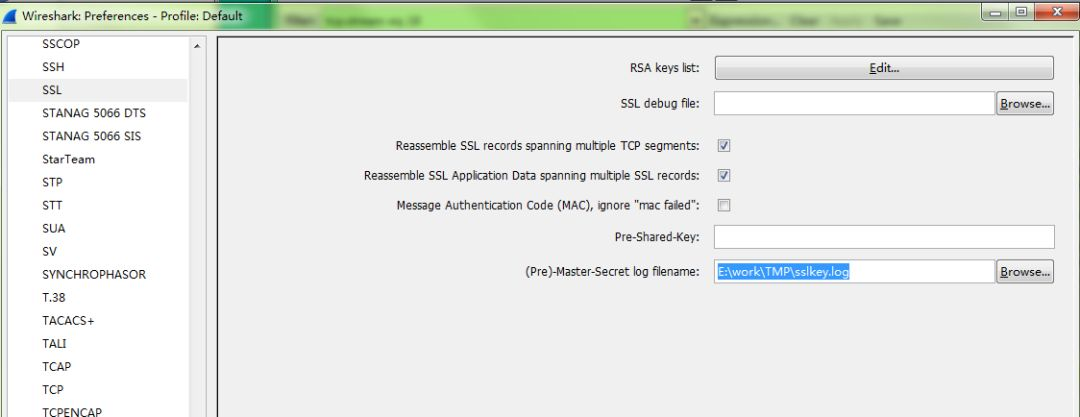 密钥成功导出到本地啦。现在可以将密钥应用到Wireshark了。具体路径如下:菜单栏Edit——Preferences——Protocols——SSL(注意,不论是SSL还是TLS这里都是SSL,没有单独的TLS选项),在(Pre)-Master-Secretlog filename中选择刚才设置的变量值。