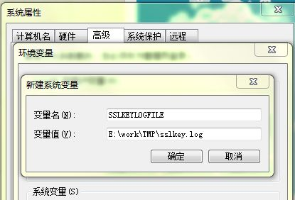 解密方式有好几种,介绍我觉得最简单的,通过浏览器保存的TLS 会话中使用的对称密钥来进行数据解密。在浏览器接收到数据之后,会使用秘钥对数据进行解密,部分浏览器会在某个地方会存储这个密钥,我们只要获取浏览器中的会话密钥就能解密数据。以windows系统+Chrome浏览器为例,首先要导出浏览器存储的密钥,通过计算机属性——高级系统设置——环境变量,新建一个变量名“SSLKEYLOGFILE”的变量,变量值是导出的密钥具体文件地址。