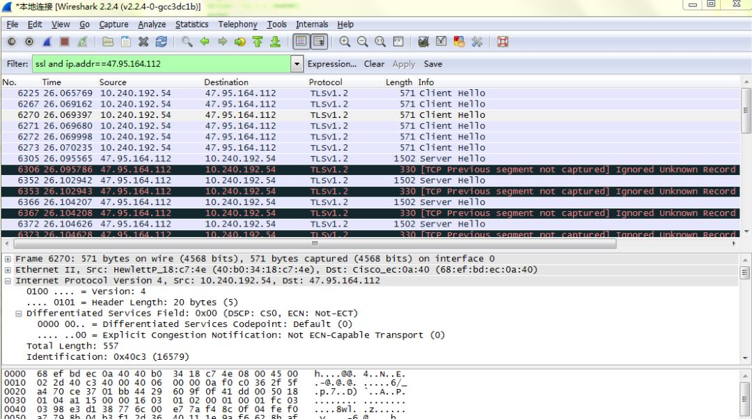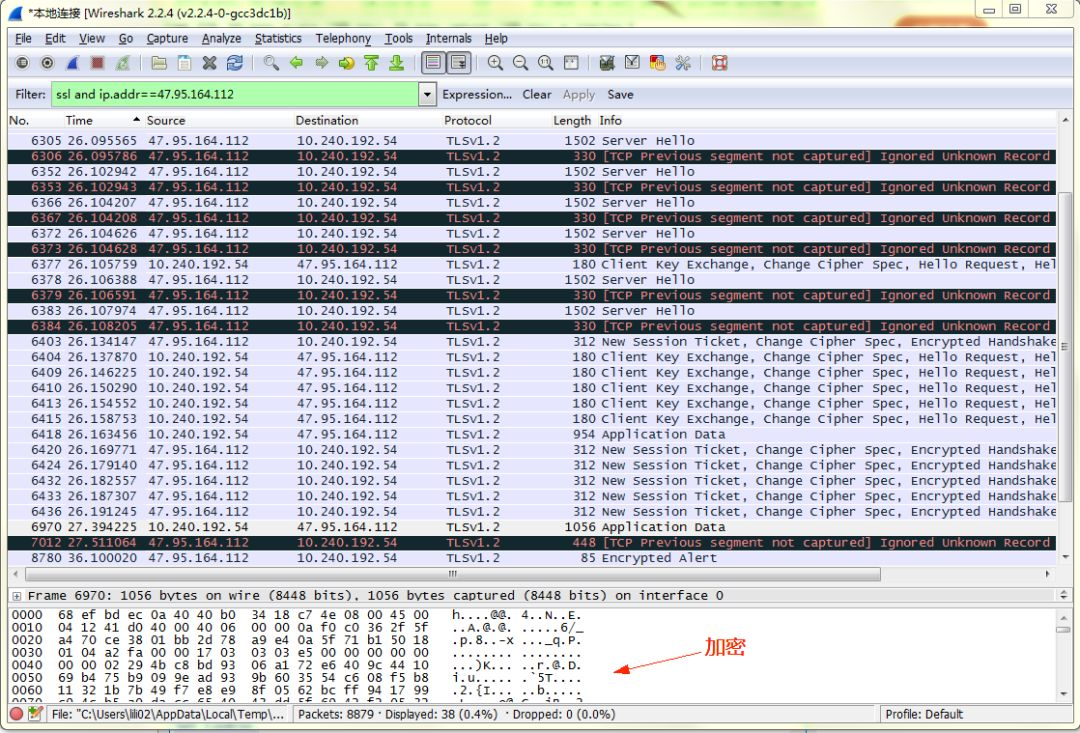 具体握手过程也可以通过Wireshark的抓包一步步验证,这里不再详述,还是专心来看看如何使用Wireshark来数据解密。我们现在获取到的Wireshark抓包数据在握手完成之后,还是各种TLSv1.2的东东,都是加密后的数据。