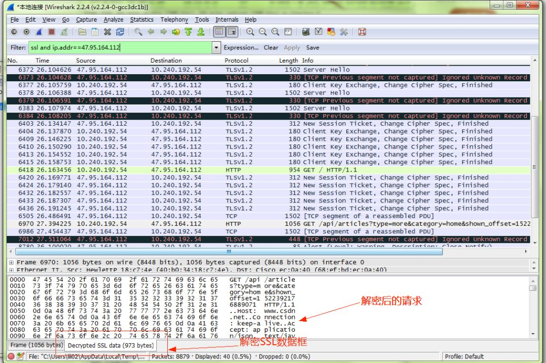 看到有HTTP了,之前都是TLSv1.2。同时,WireShark下面会有一个“Decrypted SSL data”即已解密的SSL Data的标签,点击之后你就可以如上图所示的看到已经解密的TLS数据包的相信信息了。