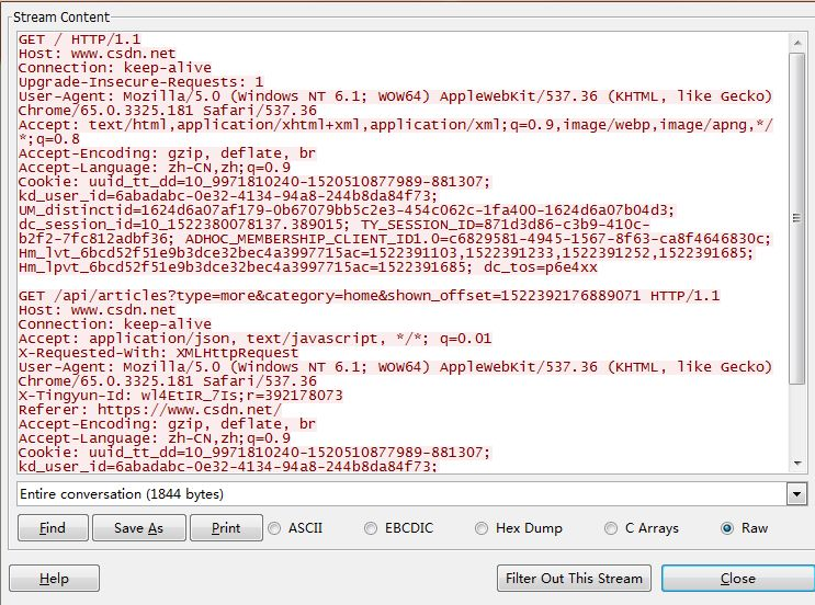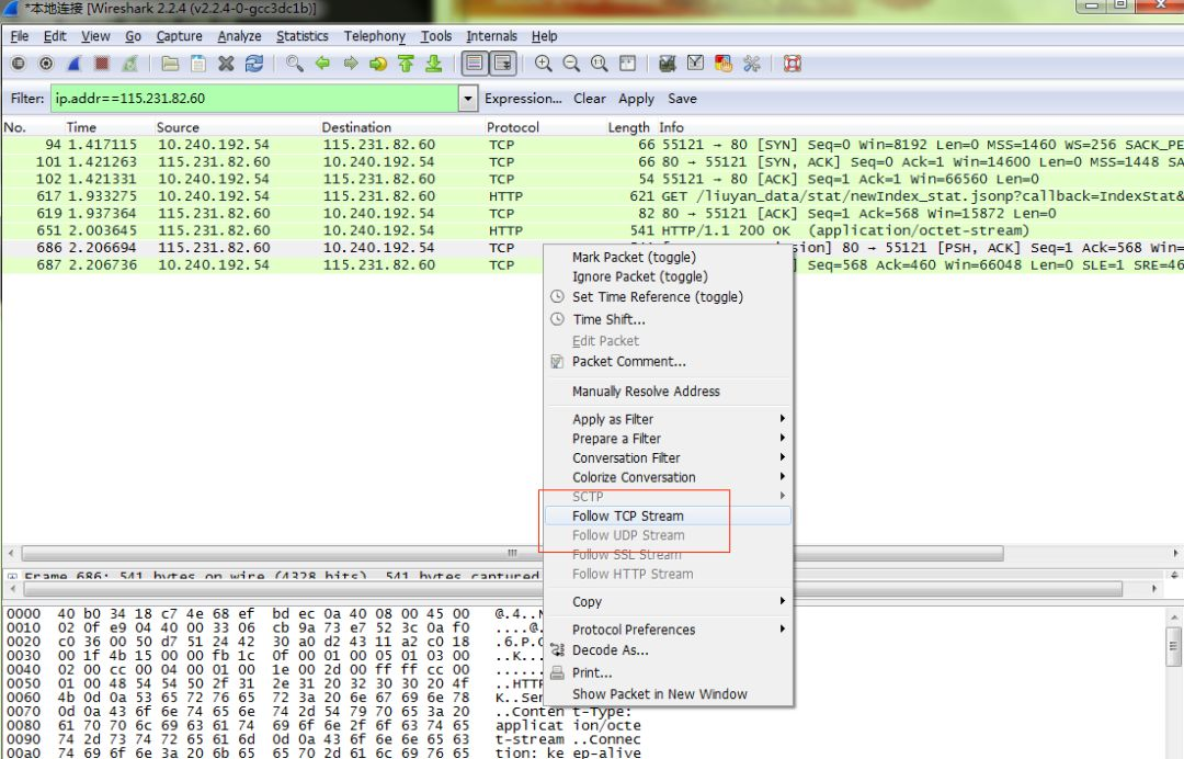 Wireshark在对HTTP请求分析时,一般是通过选定数据右键鼠标,查看Follow TCP Stream。