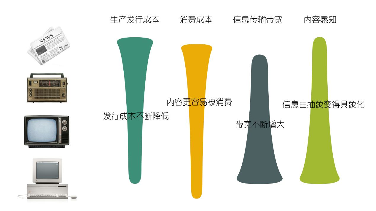 媒介具有几个基本特点:媒介具有复合性,一个新媒介不会完全取代另一个媒介;媒体具有增量性,比如报纸,开始时,只有很少一部分人花很少一部分钱去阅读很少一部分内容,但随着媒体的变革,越来越多的人购买和阅读报纸,媒体的最终竞争是用户时间,增量性是不可持续的,媒体的替代性会变得越来越强,所以我们要研究用户的获取成本和内容的品质;移动设备的出现使用户获取信息的成本大幅下降,也就是增加了用户时间的增量,所以移动互联网成为目前主流的媒介。所以短视频,就是我们定义的,在这个时代中能够吸引并且侵占用户大量时间一种形式。