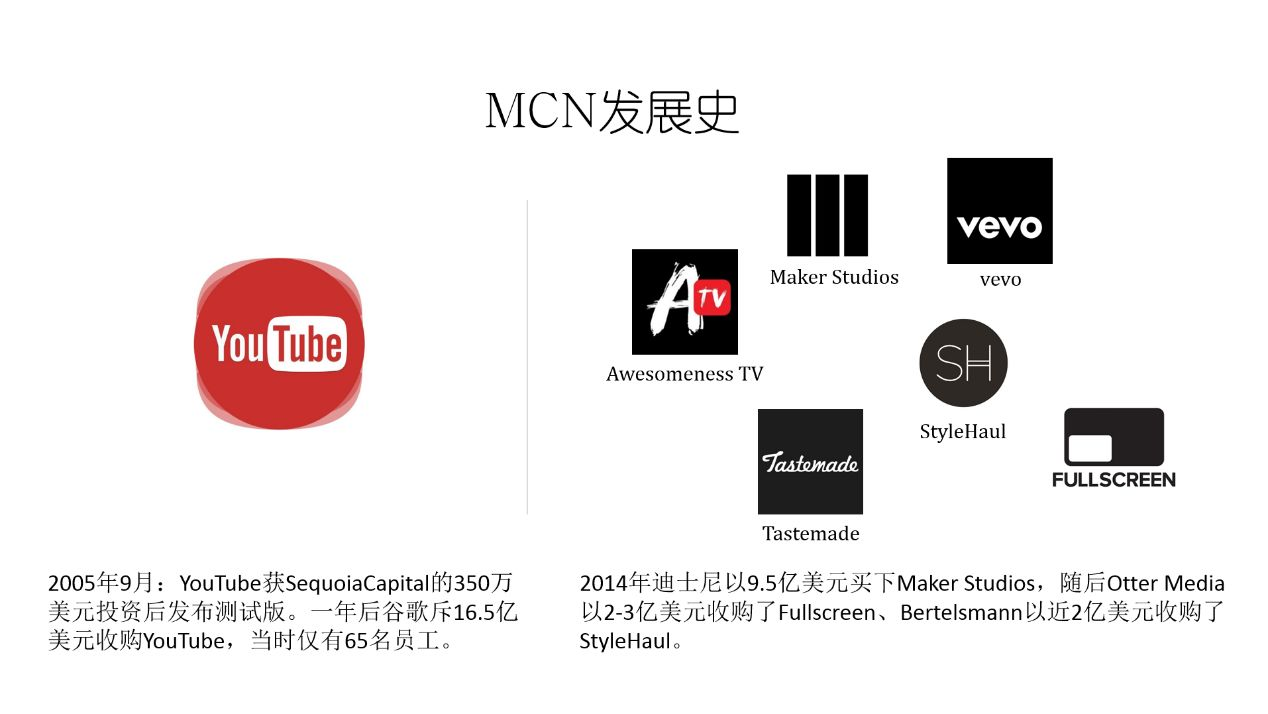 MCN的祖师是MAKER STUDIOS。2014年迪士尼以9.5亿美元买下MAKERSTUDIOS,标志着MCN商业模式的正式确立。它曾是Youtube最大内容制造商,旗下签约5.5万个Youtube频道,拥有4亿订阅用户,每月55亿次观看(2014年数据)。直到2017年迪士尼关闭Maker Studios,成立Disney Digital Network,频道缩减到300个,目前美国的MCN正在衰落,中国情况不太一样。举例一些比较好的MCN,比如Vevo音乐,它有自己独立APP,月播放量60亿次,几乎所有大牌歌手都会选择在这里首发MV,例如Kendrick的Humble,MV单曲已播放 4亿次,而Tayler swift 的LookWhat You Made Me Do 有8亿播放量。YouTube的MCN最好的就是Vevo,而中国不同,中国MCN多平台发布。中国的MCN包括视知(内容翻译,比如十九大红头文件内容翻译以及发布会内容翻译)、罐头场(日食记等)、二更视频、梨视频等。目前国内平台流量分散,平台直接对接补贴CP,头部CP内容自己可以搞定广告,架空MCN。而国外MCN也面临一些尴尬:平台集中,头部CP依靠平台广告分成活得很好;CP如果需要流量,可以在彼此之间以互换粉丝的形式合作;MCN生存空间逐渐被挤压。YouTube分成模式为平台 45% 、MCN22% 、CP 33%。