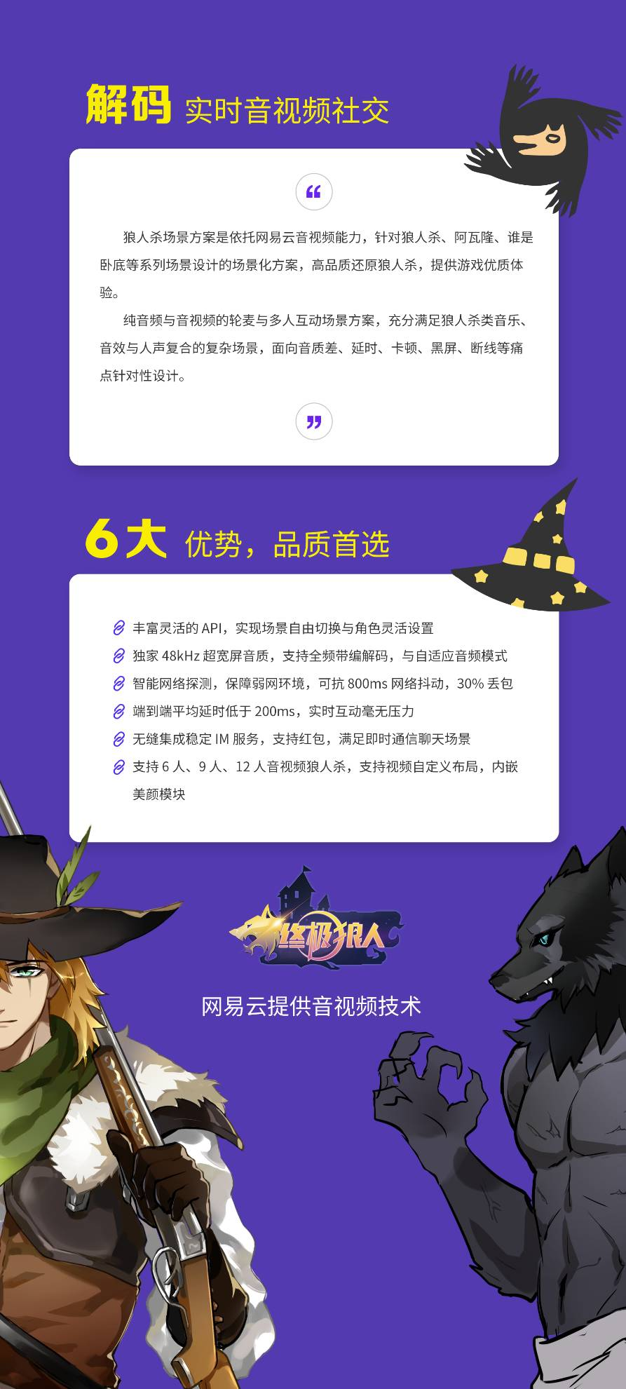 终极狼人杀作为独立游戏平台,能在短时间内迅速打开局面,完成实时音视频社交技术开发、短时间内获得用户青睐,与网易云底层技术的易用性、高性能和生态化是分不开的。网易云提供了丰富灵活、易用的API,帮助终极狼人杀短时间内完成实时音视频的底层技术开发,实现场景的自由切换与角色的灵活设置,从而迅速搭建起狼人杀所需的基本技术框架。