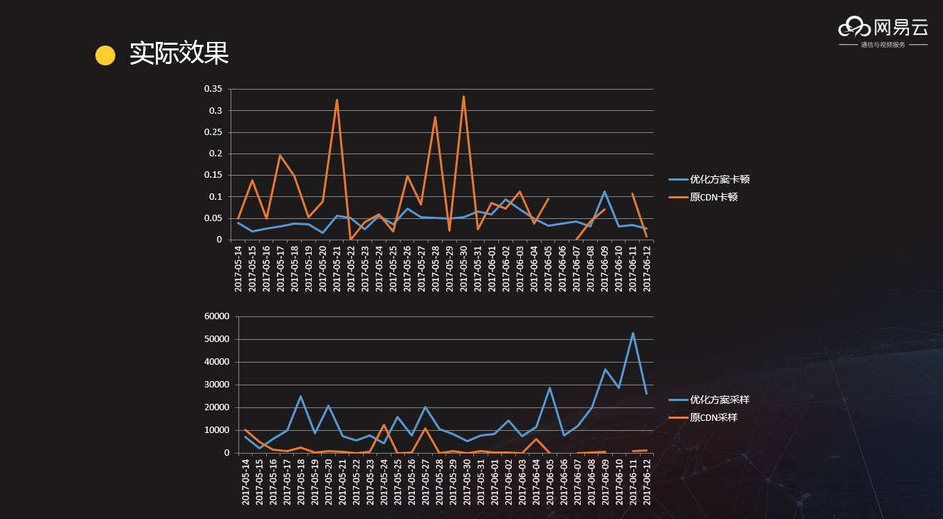 这个是我们实际处理的效果,我们从今年5月份开始就逐渐把流量从CDN厂商切换到我们自己的源站服务器上。上面这张图是卡顿率的一个图,下面是采样点的一个对比,可以看到上面那张图,使用我们自己源站服务器卡顿率还是比较低,维持在一个比较低的水平,相对于CDN厂商这种波动,我们还算是一个比较稳定的过程。