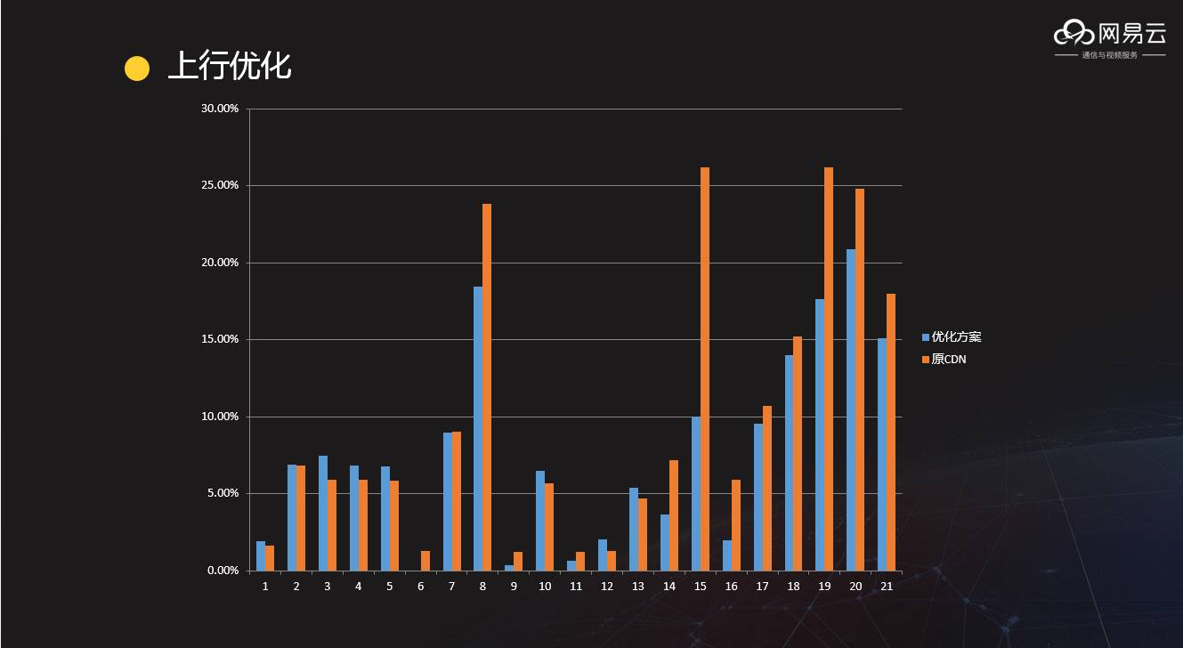 这个是我们当时上行优化测试出来的数据;蓝色是我们优化后的结果,橙色是原方案的对比,我们可以看到,大部分的卡顿率都是有所下降的,有一些可能它在比较小的幅度上面会有额外一点点的增加,但是这一部分在后面中间一公里优化的时候会变得非常小。