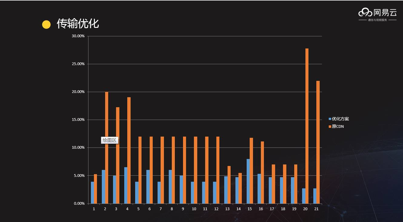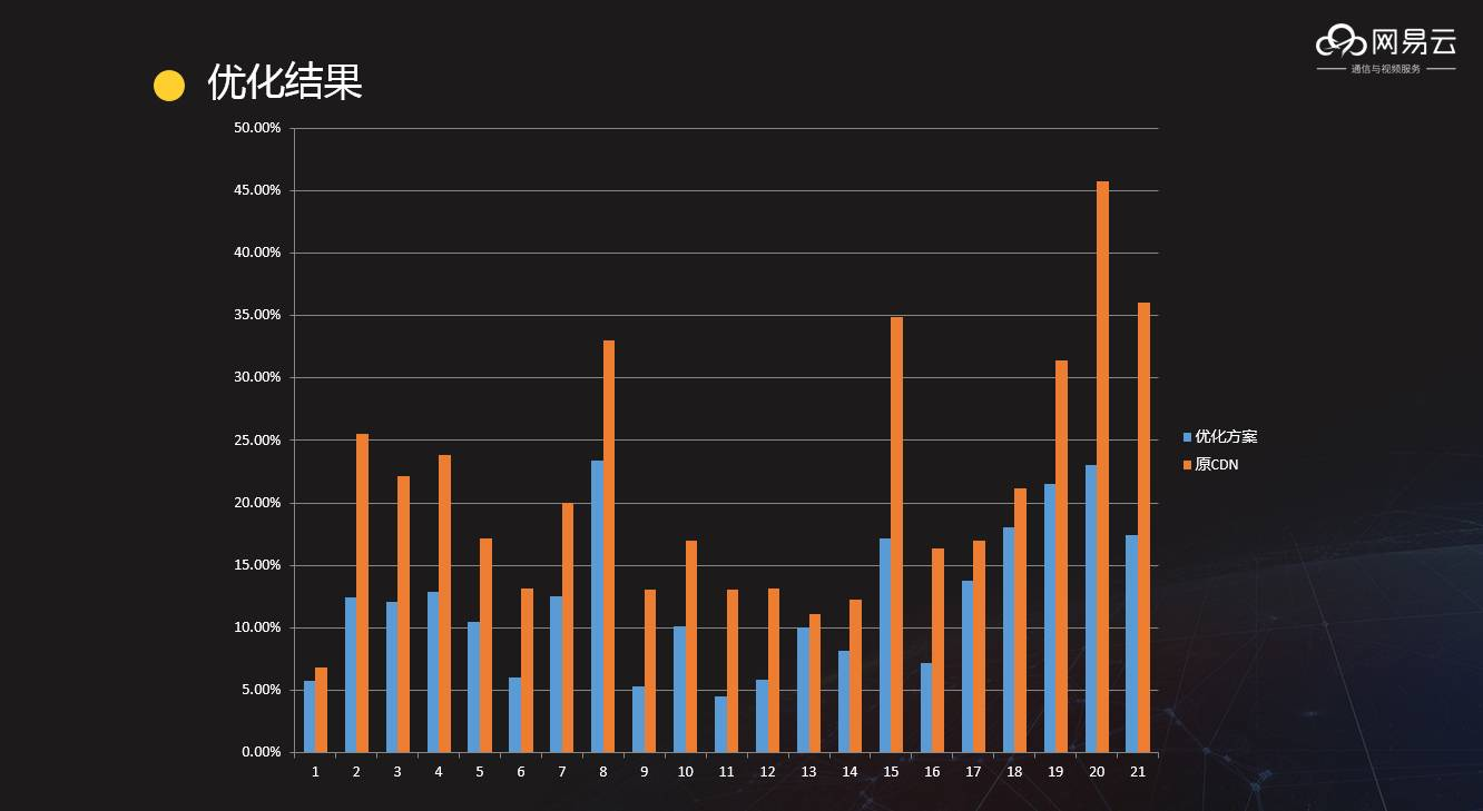 这张图是我们整体评估出来的一个测试结果,测试结果上面来看:我们的数据整体来说已经比原来CDN厂商要好很多,大部分都能优化将近一半以上。