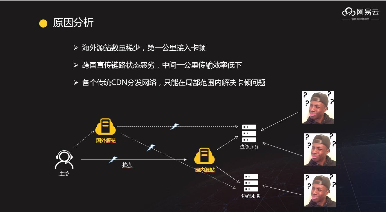 还有一种场景是部分CDN厂商在国外是有一些源站的,但是他们在源站和自己国内的节点之间没有进行相应的链路优化,这个时候从国外源站一直到下发到边缘节点的这一段过程,网络传输效果较差,相当于只是把主播到国内源站的这一段推流过程放到了网络传输的中间一公里,以上是出现问题的主要两种场景。