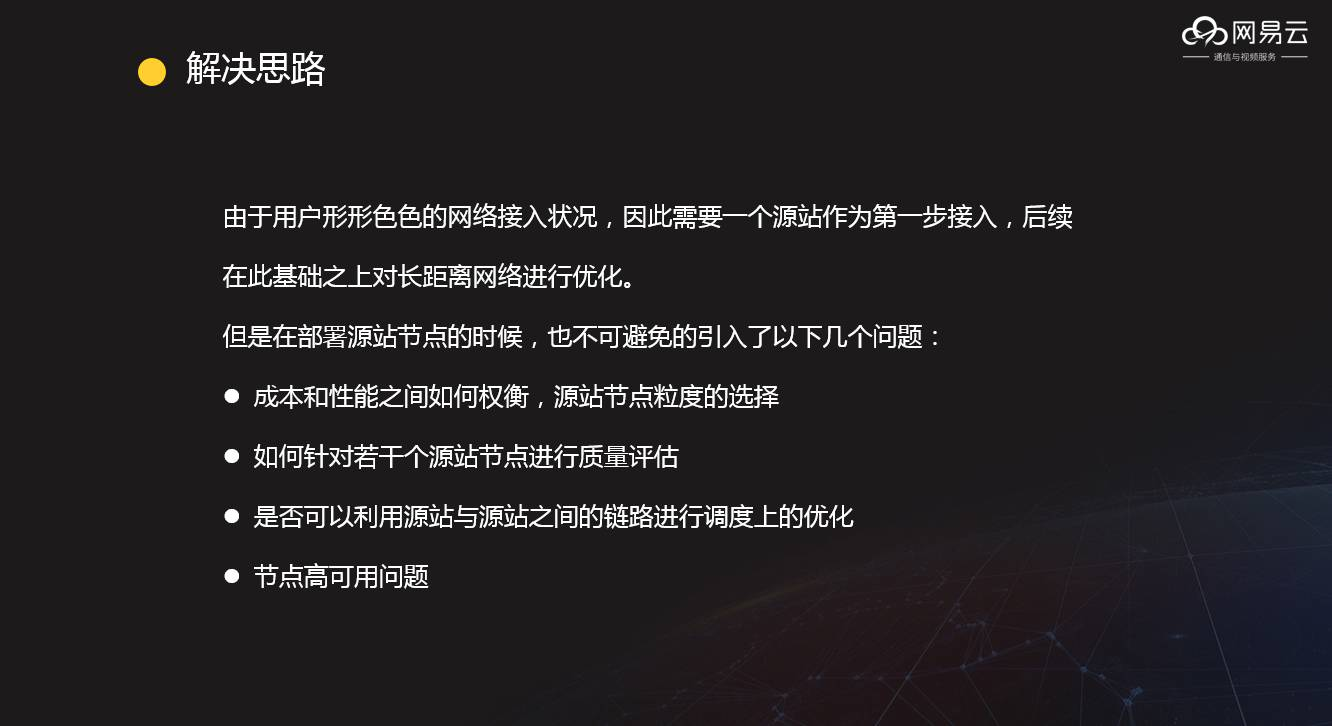 针对于这个问题,网易云通过自建CDN源站节点来处理这种场景,因为用户上行节点推流一般网络状况都不一样,有WiFi、4G,我们需要通过自建CDN先把主播的流接过来,然后再通过自建的CDN和回国链路之间进行中间一公里的一些优化,来彻底解决这个问题。但是部署节点也有一个比较麻烦的问题,就是成本和性能,如果选择了一个源站覆盖密度非常高,这个时候用户体验肯定会好很多,但是你的成本也就特别高,而且你的主播也并不是一定会用到所有的节点,容易造成资源的浪费;相反,源站覆盖密度比较粗,那主播的问题就很有可能并没有得到解决,成本还是浪费了。