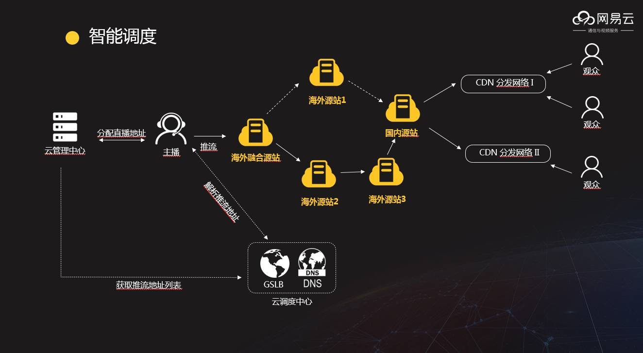 这是我们整个的流程图,主播要开始推流的时候,会先登录云管理中心去请求一个推流列表,推流列表经过云调度中心去把这个推流地址转换成一个实际推流的源站IP,云调度中心主要分成两块,一块是中心调度,是实时的,能实时监控所有的源站;还有一块是基于DNS,因为网易云业务本身有不少第三方的推流用户,这种场景是不经过中心调度的,因此我们需要拥有一个DNS调度中心,在这两个调度背后还隐藏着一个大数据平台,大数据平台在整个解决问题的过程中发挥一个比较大的作用:所有的数据,包括推流和拉流,这些数据都会汇总到统计平台上,统计平台最后就会完成链路调度的选优。当主播获取到这个相应的IP以后,会推流到自建的海外CDN源站然后走回到国内源站,在国内还可以利用融合CDN的优势来通过不同的CDN网络进行分发,便于不同的观众从质量较好的边缘节点进行拉流观看。