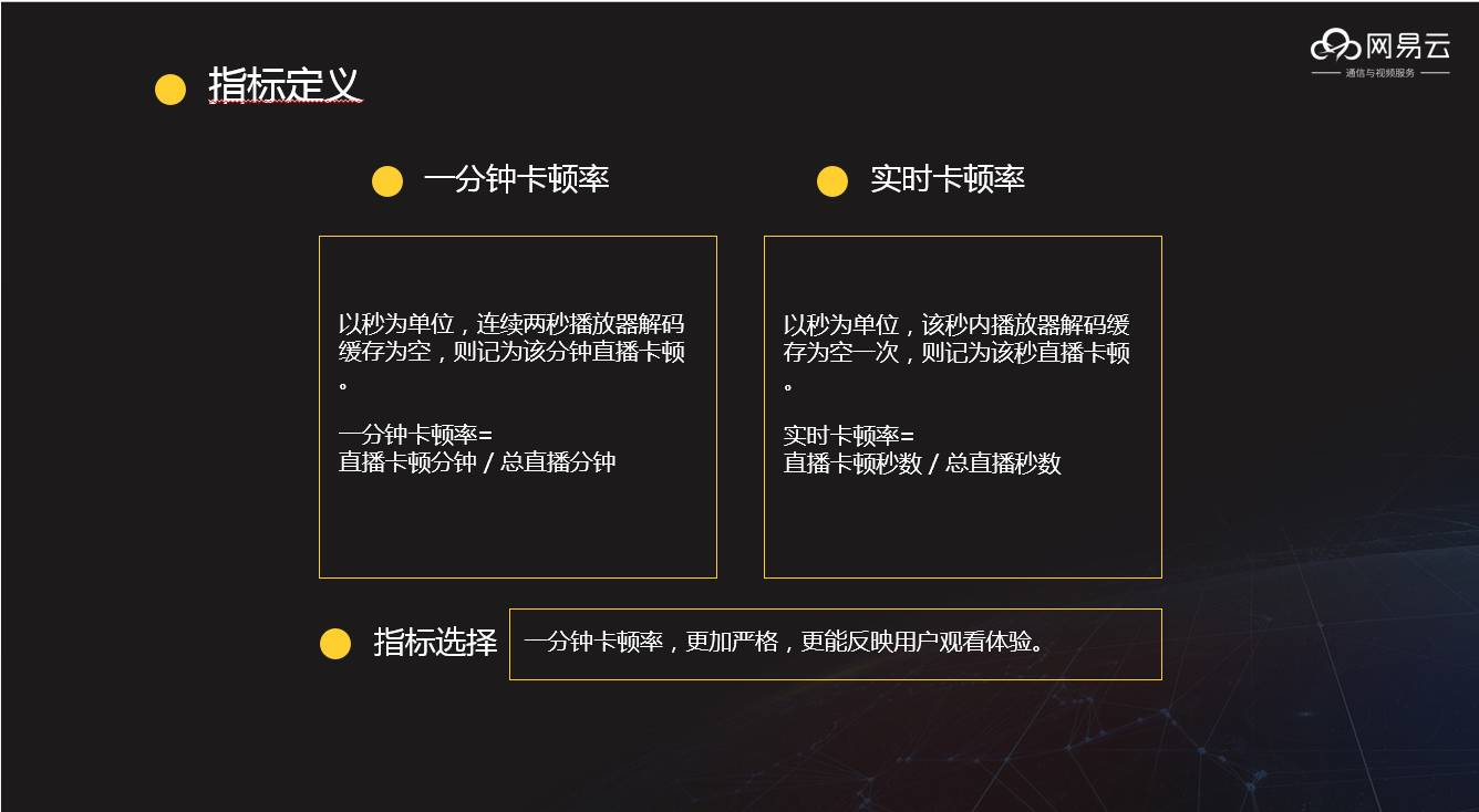网易云对卡顿有两种衡量指标,一种是实时卡顿率,以秒级为单位,如果播放器缓冲区空了,这一秒就记为卡顿,总卡顿率的计算方法就是直播卡顿的秒数除以总直播秒数;但是通常我们还会用另一种卡顿率的指标,也是以秒级为单位,但是观察的不是单纯一秒之内的卡顿,我们考虑的是连续两秒卡顿,这个时候用户会非常明显的感觉到播放异常,此外,卡顿的出现一般也不会是跳跃式的卡顿,如第一秒卡,第三秒卡,第五秒卡这样,因此两秒内连续卡顿发生,我们就标记整分钟卡顿,这个的总卡顿率就是一个直播卡顿的总分钟除以总的直播时间。一般来说选择一分钟卡顿率这种指标会比较严格一点,因为它更可以直观反映出用户体验。