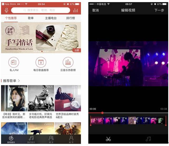 网易云音乐在音乐类app里率先推出了短视频功能,用户只要在短视频编辑器里剪辑好视频,添加好背景音乐,就可以从本地发布短视频内容到网易云音乐动态中。
