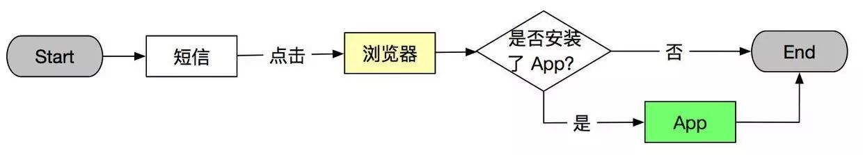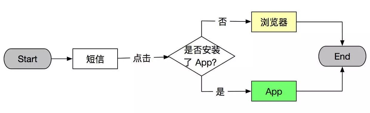 第二种,经浏览器中转唤起,也就是点击短信链接后先用浏览器打开对应页面,在页面中进行“判断”(实际上不是真正的判断,而是发一个scheme给系统)如果安装了 App 就跳转到 App,否则就停留在当前页。