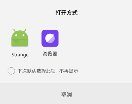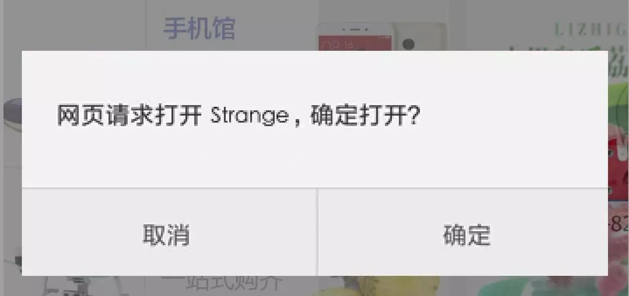 window.location.href="strange://login"因为浏览器只会处理http、https协议,当浏览器打开我们的 H5 下载页面遇到不能处理的私有协议 strange,就会发 intent 给系统,如果有 App 可以处理这个协议会出弹框询问用户是否用该 App 打开,否则什么都不做,具体效果: