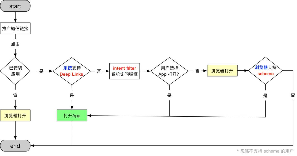 · 如果系统因为各种原因不支持 Deep Links,备选方案是 intent filter,不过会出弹框让用户选择用哪个 App 打开链接;