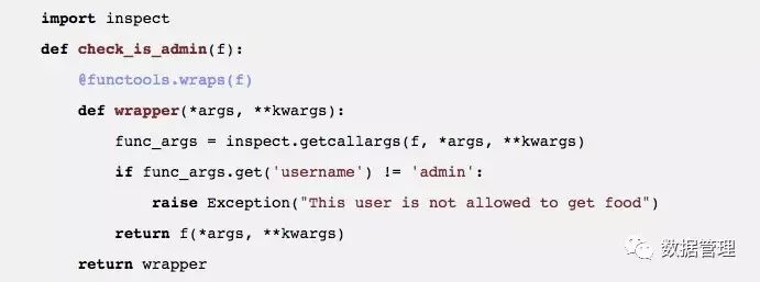 这段代码看起来没有任何问题,但是,执行将会出错,因为,username是一个位置参数,而不是一个关键字参数。我们在装饰器里面,通过kwargs.get('username')是获取不到username这个变量的。为了保证灵活性,我们可以通过inspect来修改装饰器的代码,如下所示: