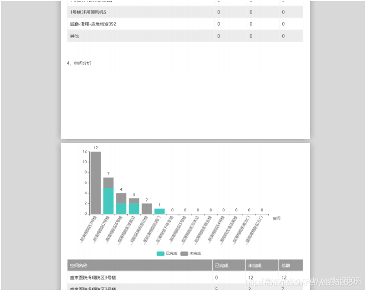 // 导出日报$("#exportall").on("click", function (url, name, data1) {if (confirm("您确认下载该PDF文件吗?")) {var id='monthlyReport';html2canvas($("#"+id), {background: "#FFFFFF",//如果指定的div没有设置背景色会默认成黑色,这里是个坑onrendered:function(canvas) {//未生成pdf的html页面高度var leftHeight = canvas.height;var a4Width = 595.28var a4Height = 841.89//一页pdf显示html页面生成的canvas高度;var a4HeightRef = Math.floor(canvas.width / a4Width * a4Height);//pdf页面偏移var position = 0;var pageData = canvas.toDataURL('image/jpeg', 1.0);var pdf = new jsPDF('x', 'pt', 'a4');var index = 1,canvas1 = document.createElement('canvas'),height;pdf.setDisplayMode('fullwidth', 'continuous', 'FullScreen');var pdfName='后勤月报';$('.head-content').append($('' +' 正在生成第1页,共页...' +''));function createImpl(canvas) {if (leftHeight > 0) {index++;var checkCount = 0;if (leftHeight > a4HeightRef) {var i = position + a4HeightRef;for (i = position + a4HeightRef; i >= position; i--) {var isWrite = truefor (var j = 0; j < canvas.width; j++) {var c = canvas.getContext('2d').getImageData(j, i, 1, 1).dataif (c[0] != 0xff || c[1] != 0xff || c[2] != 0xff) {isWrite = falsebreak}}if (isWrite) {checkCount++if (checkCount >= 10) {break}} else {checkCount = 0}}height = Math.round(i - position) || Math.min(leftHeight, a4HeightRef);if(height<=0){height = a4HeightRef;}} else {height = leftHeight;}canvas1.width = canvas.width;canvas1.height = height;// console.log(index, 'height:', height, 'pos', position);var ctx = canvas1.getContext('2d');ctx.drawImage(canvas, 0, position, canvas.width, height, 0, 0, canvas.width, height);var pageHeight = Math.round(a4Width / canvas.width * height);// pdf.setPageSize(null, pageHeight)if(position != 0){pdf.addPage();}pdf.addImage(canvas1.toDataURL('image/jpeg', 1.0), 'JPEG', 0, 0, a4Width, a4Width / canvas1.width * height);leftHeight -= height;position += height;$('.pdfProgress').text(index + 1);$('.pdfTotal').text(index + Math.ceil(leftHeight / a4HeightRef));if (leftHeight > 0) {setTimeout(createImpl, 500, canvas);} else {pdf.save(pdfName + '.pdf');$('.pdfTip').remove();}}}//当内容未超过pdf一页显示的范围,无需分页if (leftHeight < a4HeightRef) {pdf.addImage(pageData, 'JPEG', 0, 0, a4Width, a4Width / canvas.width * leftHeight);pdf.save(pdfName + '.pdf')} else {try {pdf.deletePage(0);$('.pdfTip').show();$('.pdfTotal').text(index + Math.ceil(leftHeight / a4HeightRef));setTimeout(createImpl, 500, canvas);} catch (err) {console.log(err);}}}})}});