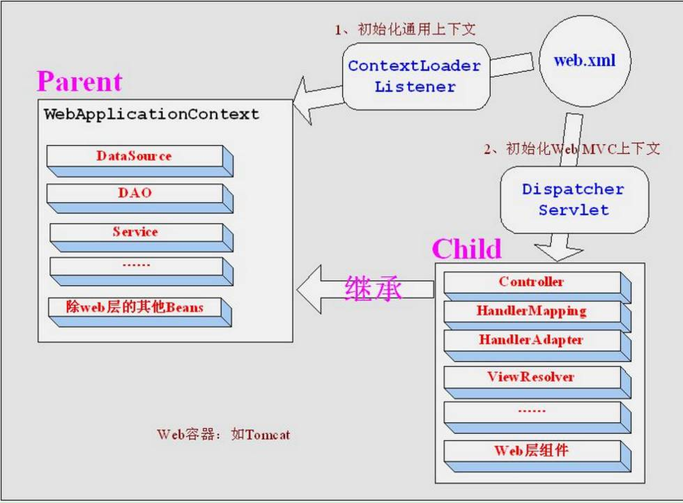DispatcherServlet初始化的上下文加载的Bean是只对Spring Web MVC有效的Bean,如Controller、HandlerMapping、HandlerAdapter等等,该初始化上下文应该只加载Web相关组件。