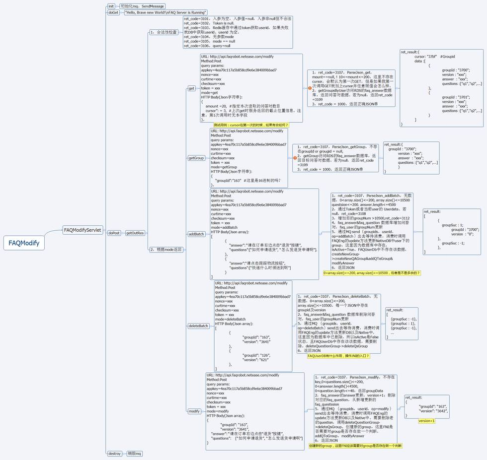 在我新take的一个FAQ智能语音机器人项目中,在没有任何需求设计接口文档的情况下,要开展测试工作,只能先从源码开始,之前的经验帮助了我,理清楚了所有接口的处理逻辑(毕竟是半路接手项目,只能先解决问题为先)。基本上一两天功夫就可以把源码读懂。当时的几个思维导图之一如下: