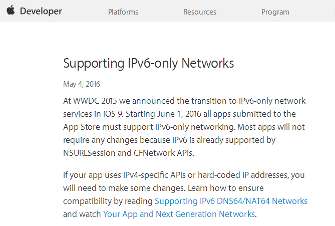 2016年5月初,Apple公司官方发文告知用户,6月1日之后提交的版本,必须支持 IPv6-only 的网络环境。为此,Apple还发布了官方指南告知用户如何兼容 IPv6-only 的环境。