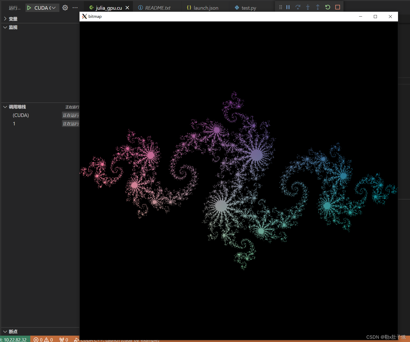 {"name": "CUDA C++: Launch", //默认"type": "cuda-gdb", //默认"request": "launch", //默认//需要运行的文件,我这里是文件夹下的无扩展名运行文件"program": "${fileDirname}/${fileBasenameNoExtension}", //launch前的编译任务,我这里是mynvcc"preLaunchTask": "mynvcc",//环境配置,与第三部分相关"env":{"DISPLAY":"localhost:10.0"},