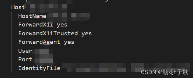 Host //随便取HostName //服务器IPForwardX11 yes //三个允许X11的配置ForwardX11Trusted yesForwardAgent yesUser //登录用户IDPort //服务器端口号IdentityFile "" //本地RSA密钥位置