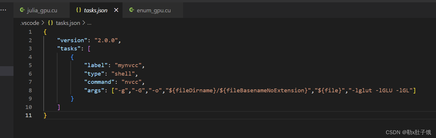 {"version": "2.0.0","tasks": [{"label": "mynvcc", //与launch.json的preLaunchTask保持一致"type": "shell","command": "nvcc","args": ["-g","-G","-o","${fileDirname}/${fileBasenameNoExtension}","${file}","-lglut -lGLU -lGL"]}]