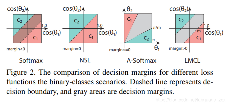 m的加入,使得模型的学习难度增大。 与以往增加margin的方式不同,这种方式通过增加angular-margin来增加类间距离。如在二分类情况下,分类边界增加的margin如下图所示。