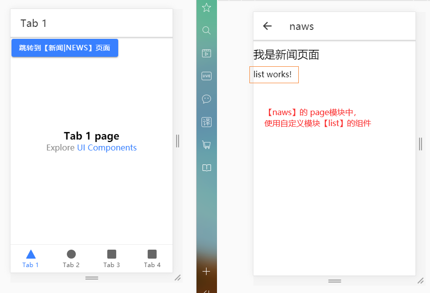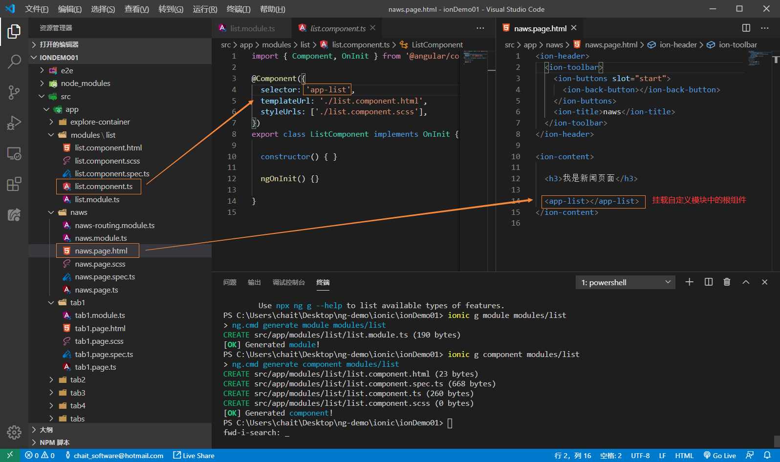 在Angular 中 组件和组件之间可以实现通信,而在 Ionic 中 每个page 是一个模块,而模块里面的组件和其他 page 模块中的组件是无法直接通信的,此时就可以使用自定义模块间接的实现模块之间的通信,类似ng 中的模块配置过程,需要把 page(模块module)暴露出来给其他外部page(模块module)使用,实现步骤如下图所示;
