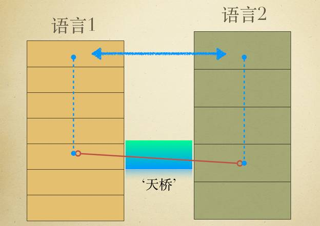 这时候,可以把每一种语言的运行支持比作一栋楼房(原谅我这不甚恰当的类比,但有没有发现其实二者架构神似?),那么现在想要达到的目标好比就是,把一条消息从一号楼的顶楼送到二号楼的顶楼,这完全可以用我们日常生活中的简单常识搞定对不对?很显然,要做的是,确定这两栋楼之间有没有天桥连接(一楼也可以被认为是0高度的天桥……),如果一号楼的楼层x与二号楼的楼层y之间存在一条路径的话,信使就可以首先从一号楼的顶楼下到楼层x,然后通过天桥到达二号楼的楼层y,最终上到二号楼的顶楼就达成了我们的目标!