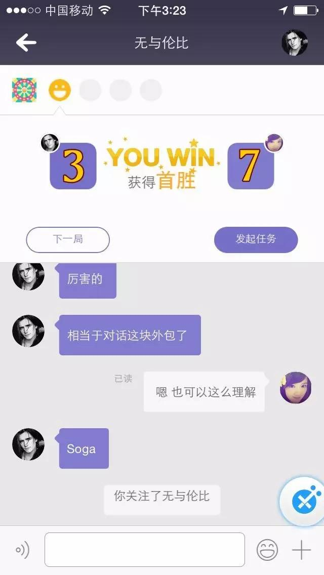 能量速配功能帮用户找到一起玩的人,合不来,聊不来,系统24小时自动帮你清理陌生人;游戏简单有趣,剪刀石头布、疯狂大转盘、骰子猜大小等;游戏分出胜负后,胜方发布任务,由另一方完成,各种奇葩任务,让你脑洞大开。