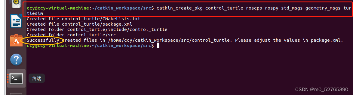 在catkin_workspace的src目录下创建control_turtle功能包,使用命令为: