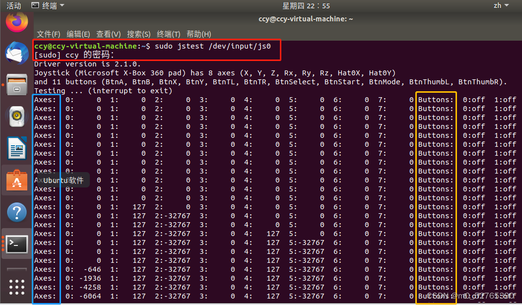 sudo 命令可以提高用户权限,因此要先输入密码。输入密码后,回车,就可以看到很多个Axes(轴)和Buttons(按钮),可以按手柄上的按钮或者摇动操作杆,就会看到终端上对应位置的数字的改变。
