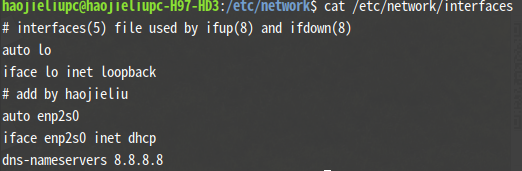 dns-nameservers 8.8.8.8 保存退出然后重启后即可。记得修改enp2s0为你的网卡名称,inet dhcp表示使用dhcp方式也可使用静态ip inet static。实例如下