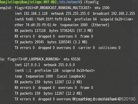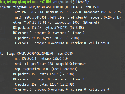 1、输入命令 cat /etc/network/interfaces 查看当前网络设置