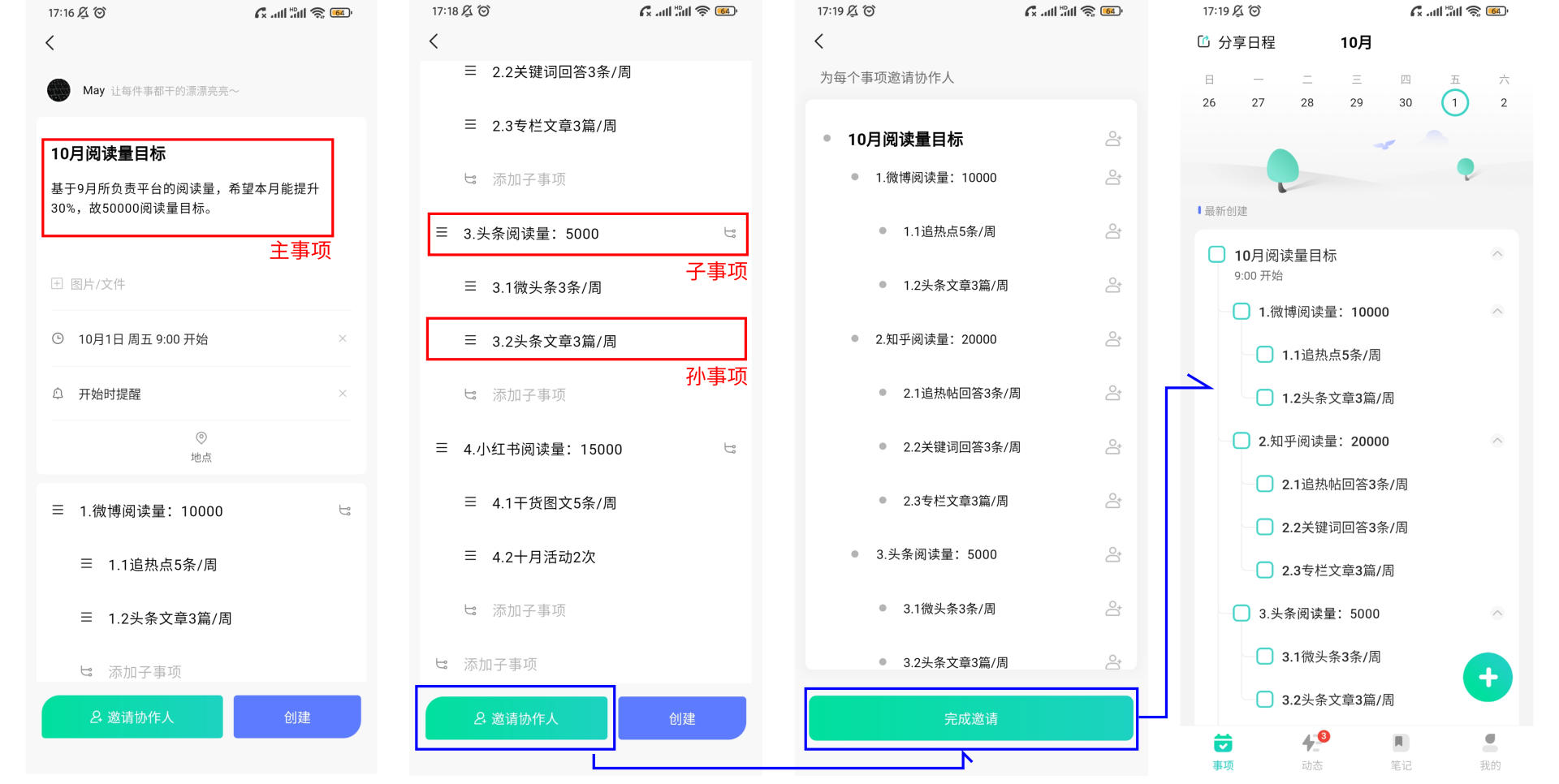 除了事项创建和日程规划,面对复杂的目标任务,「飞项」待办事项清单工具也能完美消化。「飞项」拥有事项分解功能,可以将复杂事项进行三级拆解,拆解出的每个子事项都可以进行时间地点等详细定制,并且可以根据需要,进一步派发给他人协作,共同完成任务。