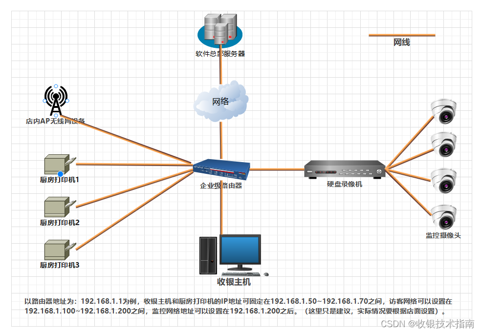第一期说餐饮大概的网络规划,后期会详细到每个业态,包含收银中的业态模式、打印设置等。 1、使用场景:餐饮门店收银网络,监控网络,访客网络等使用。 2、设备需求: 2.0、网络基本设备:企业级路由器、企业级交换机、AP等。 2.1、收银网络:收银机、厨房打印机。 2.2、监控网络:监控主机、摄像头。 2.3、访客网络:路由器或者AP 3、中小型餐饮门店尽量使用企业级路由器(家用路由器或者办理宽带送的路由器通常性能不足)。 4、企业级路由器开启DHCP服务器,范围在100-200之间,供访客网络使用。 5、收银机IP和厨房打印机IP尽量与监控设备IP不要靠的太近,防止与监控设备IP地址冲突,可以把收银机和打印机的IP放在50-70之间,监控设备放在200之后(这里可以根据店里实际情况设置) 6、企业级路由器接口不够,可以使用企业级交换机。 7、参考图示如下: