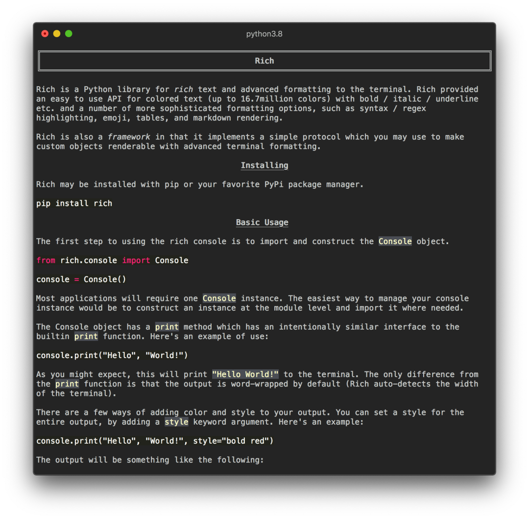 from rich.console import Consolefrom rich.markdown import Markdownconsole = Console()with open("README.md") as readme:markdown = Markdown(readme.read())console.print(markdown)
