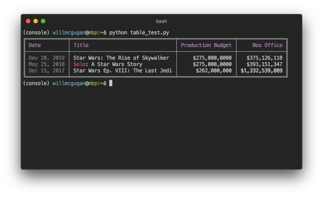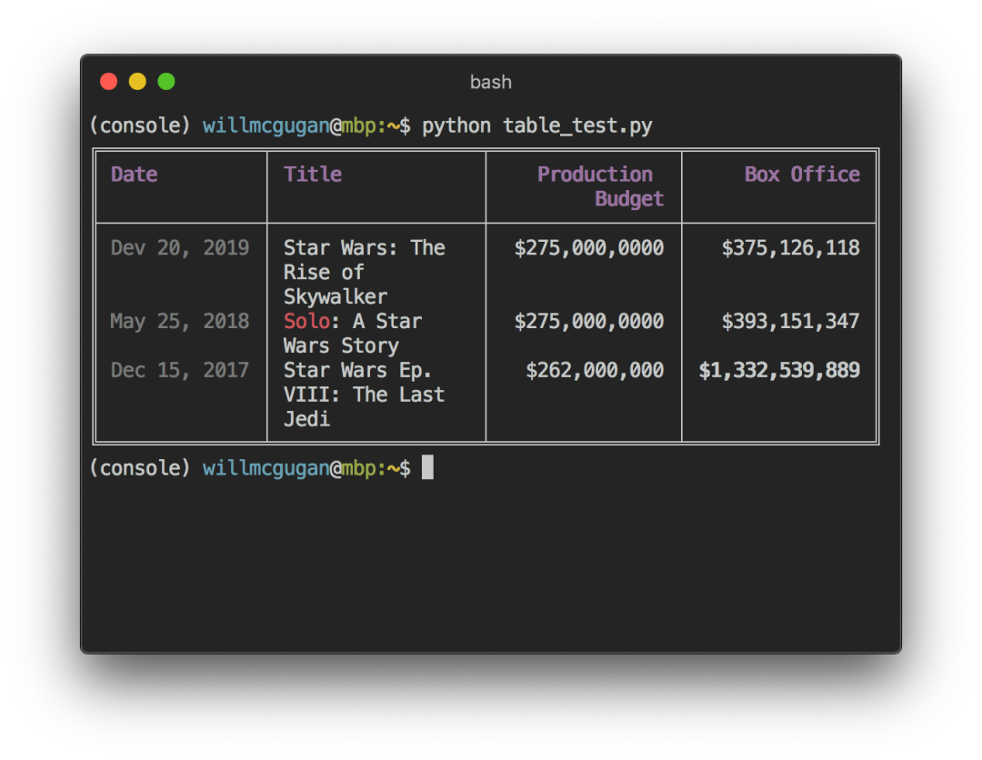 from rich.console import Consolefrom rich.table import Column, Tableconsole = Console()table = Table(show_header=True, header_style="bold magenta")table.add_column("Date",, width=12)table.add_column("Title")table.add_column("Production Budget", justify="right")table.add_column("Box Office", justify="right")table.add_row("Dev 20, 2019", "Star Wars: The Rise of Skywalker", "$275,000,000", "$375,126,118")table.add_row("May 25, 2018","[red]Solo[/red]: A Star Wars Story","$275,000,000","$393,151,347",)table.add_row("Dec 15, 2017","Star Wars Ep. VIII: The Last Jedi","$262,000,000","[bold]$1,332,539,889[/bold]",)console.print(table)