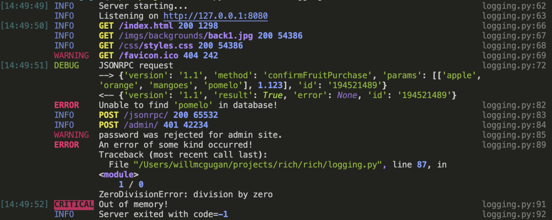 你还可以使用内置的处理类来对 Python 日志记录模块的输出进行格式化和着色。下面是输出示例: