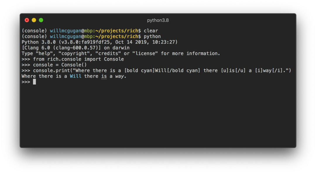 console.print("Where there is a [bold cyan]Will[/bold cyan] there [u]is[/u] a [i]way[/i].")