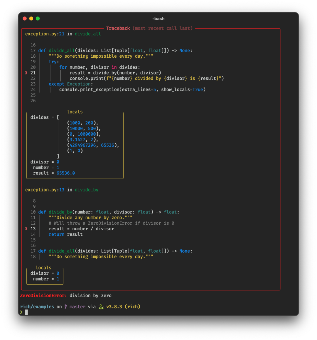 你可以将 Rich 设置为默认的回溯处理程序,这样所有异常都将由 Rich 为你呈现。