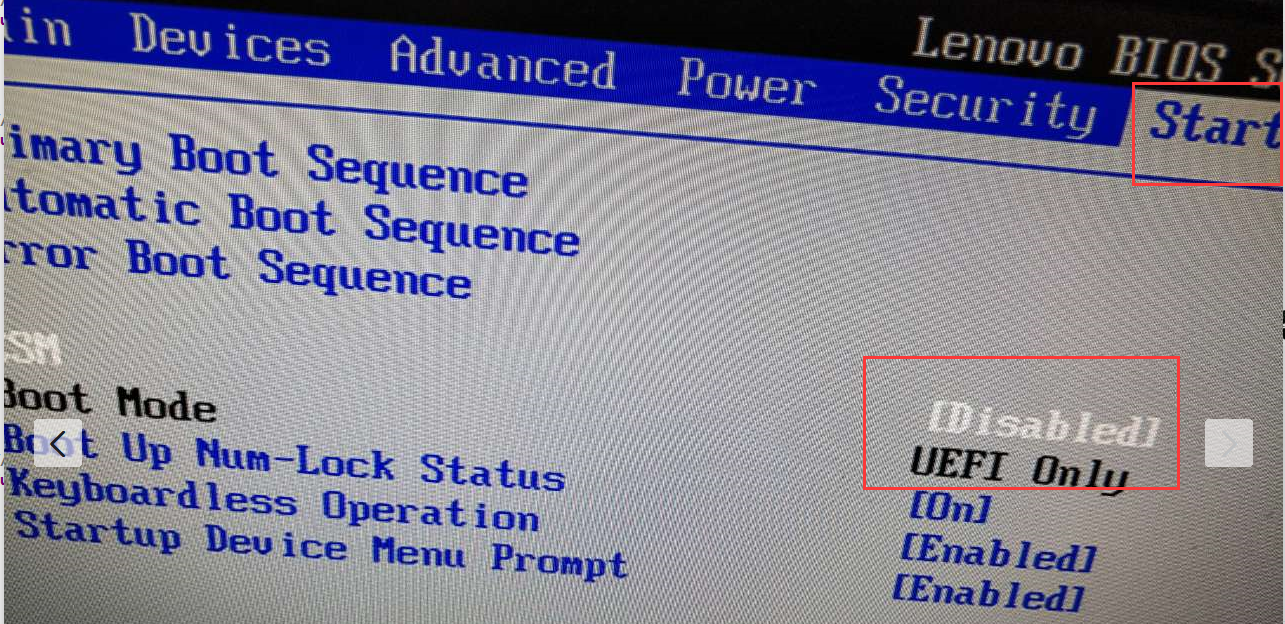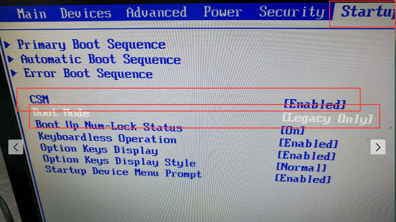 ②没有插入U盘:因为没有插入U盘,之前选择是U盘作为启动,所以就是无效的,所以需要StartUp——CSM——disabled,此时BootMode自动为UEFIOnly硬盘启动,然后重启启动就好了