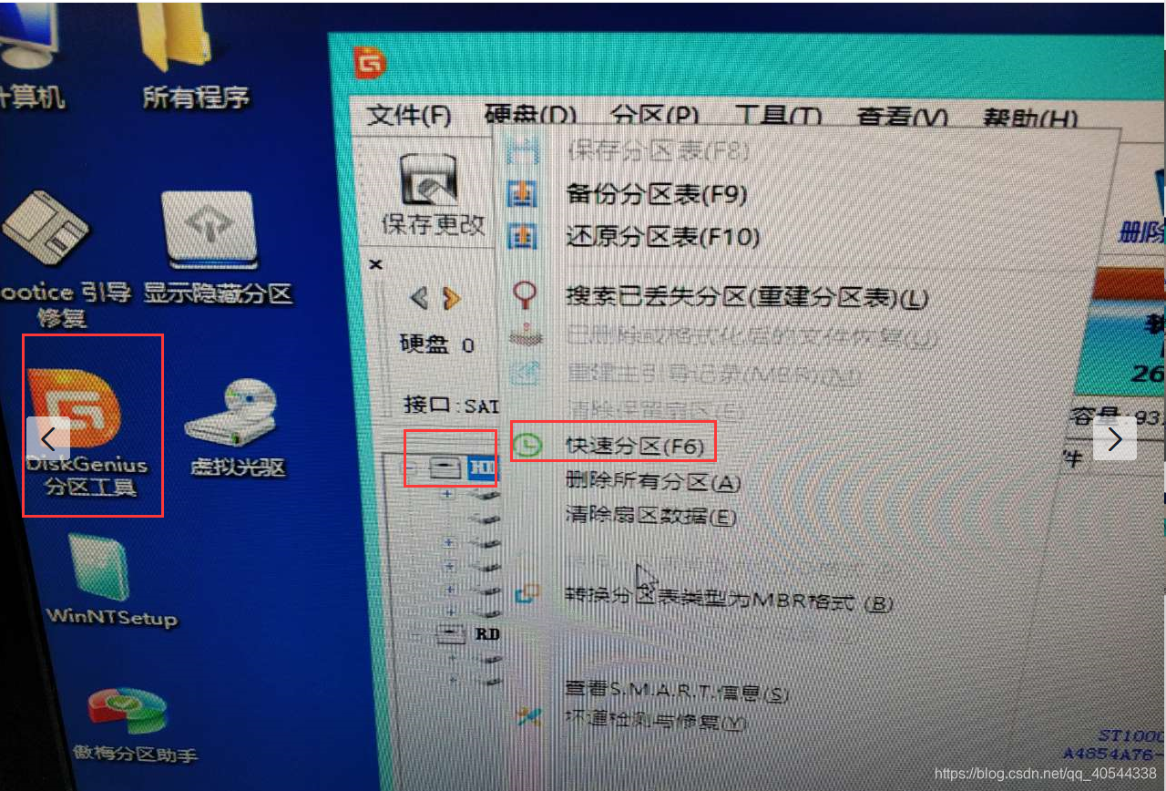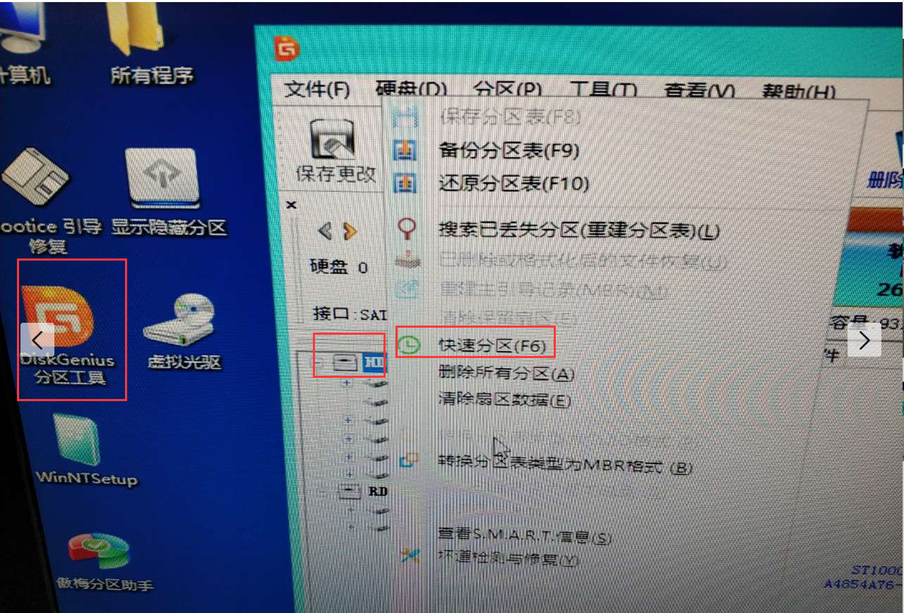 7、分区:进入到了启动桌面后,先使用分区助手,将其分区,(注意镜像系统是什么模式的就选择上面模式,镜像是GUID,分区就选择GUID;如果镜像是MBR,分区就选择MBR)(里面MBR的话重启后启动不了需要设置,后面有介绍)