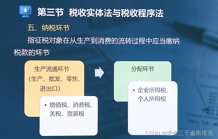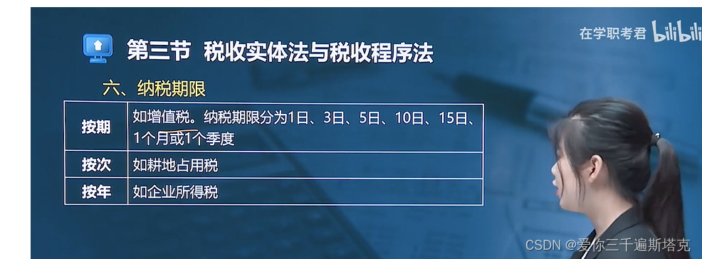 那么少部分的这个消费品,比如说像我们的金银铂钻,这个金银首饰,金银铂钻他们是在零售环节去征收的,还有像超豪华小汽车是在零售环节要进行加征的,还有我们的这个卷烟,在我们的批发环节也要进行加珍好,这个是在特定环节去缴纳的。增税是在每一个流通周转环节都要去缴纳关税,那当然就在进入股环节去缴纳了,资源税也是在我们的生产出厂环节进行缴纳。好,那么流通周转之后,到最后怎么样分配环节了,对不对?那么分配环节就是企业所的税和个人所的税是在我们分配环节去缴纳的。好,那这个是纳税环节,那再来看一下我们的纳税期限。好,纳税期限呢?就是说比如说你今天产生的纳税义务,那么你需不需要在今天就必须马上展把,把这笔税款给上交到税务机关?不需要,我们只要在这个规定的时间里面把这个税款上交到税务机关就可以了。那这个规定的时间如何进行规定?那么在这边就说到了,有按期的、按次的、按年的、好,按期的。比如说像增税,我们增税纳税期限分为是一天、 3 天、 5 天、 10 天、 15 天、一个月或者是一个季度好按次的。比如说跟力降税,你有发生这个占用跟力从事建筑物构筑物费、农业建设这个行为的时候,发生这次行为你就去缴纳,按次去纳税的,按年纳税的。比如说像我们的企业所的税,但是企业所的税你在每个月或者说每个季度的时候要进行预缴,等到年中的时候再按年进行一个汇算清缴。