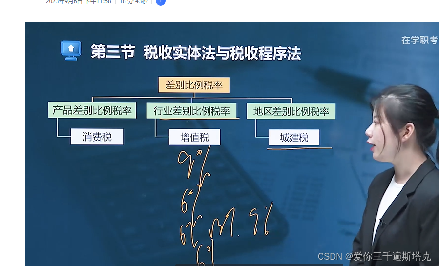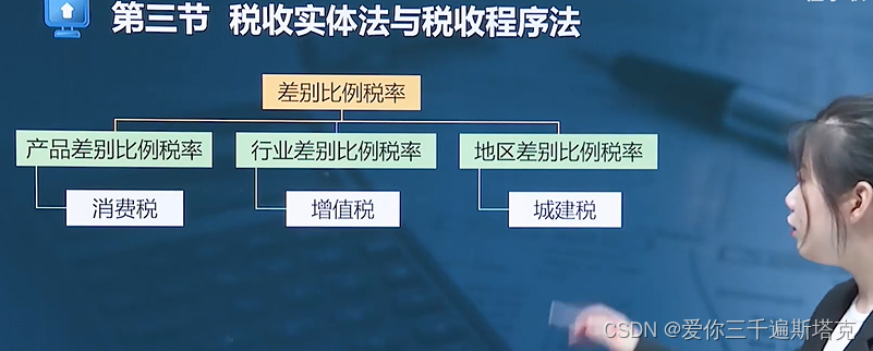 好,那么接下来我们来看一下,就是前面讲到一个差别比例税率的时候,这个差别比例税率,我们举了一个例子,是城市维护建设税,对不对? 7% 5% 1%,那么这个差别比率税率呢?我们又可以进行进一步的这个细细分,比如说产品差别比率税率、行业差别比率税率、地区差别比率税率,那么刚刚所说的城建税,它就是一个地区差别这个比例税率每个地区不同,那么税率就不一样。